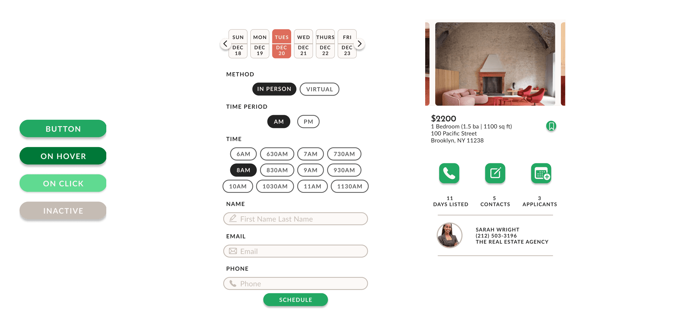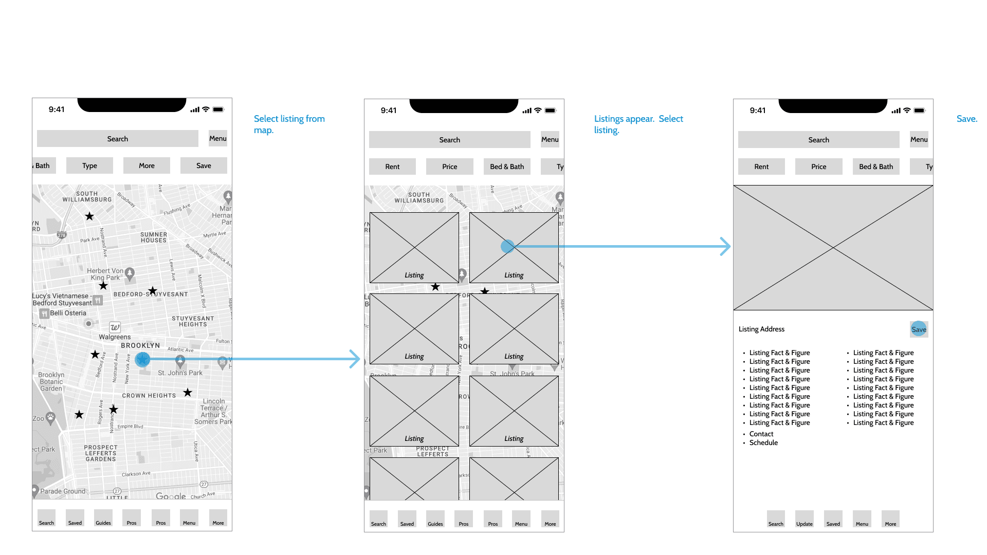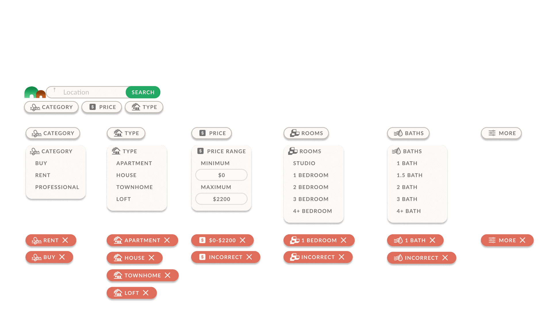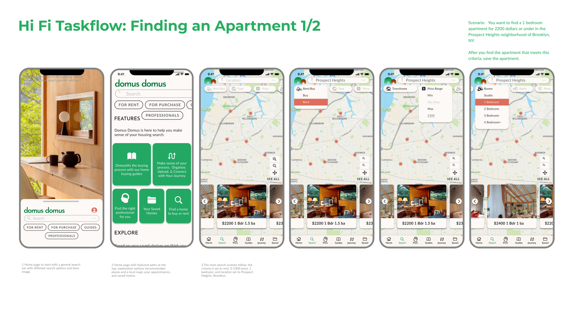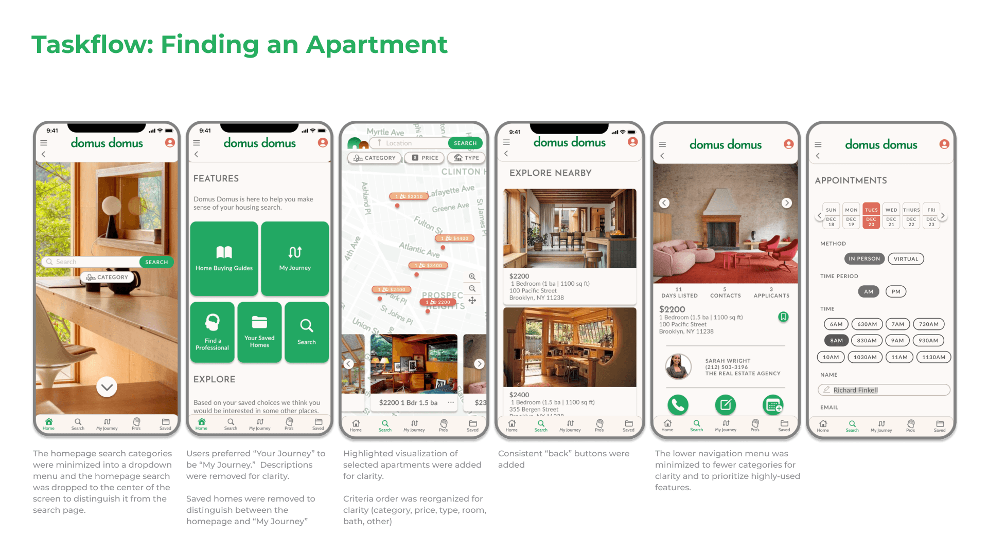 Finding an Apartment task flow user-testing revealed the logical sequence of search categories and the necessity of call to action buttons at specific moments in the flow. The Search button with a bright highlighted color was ultimately chosen to make it very clear how to proceed in the sequence. Similarly, every time the user is asked to proceed the same bright colored button was enacted.