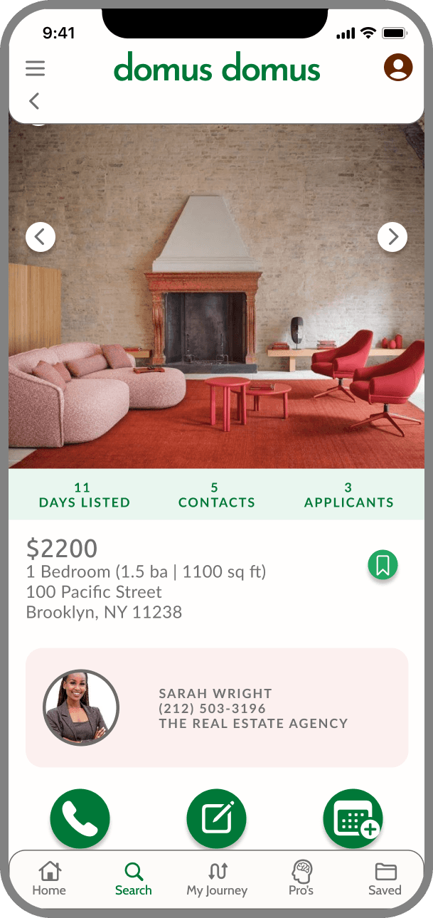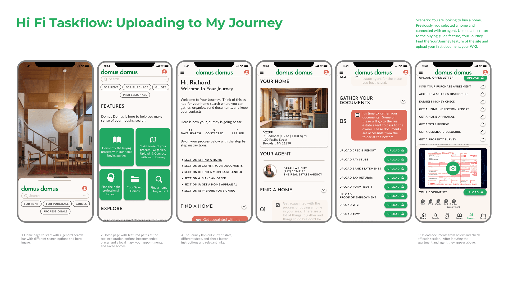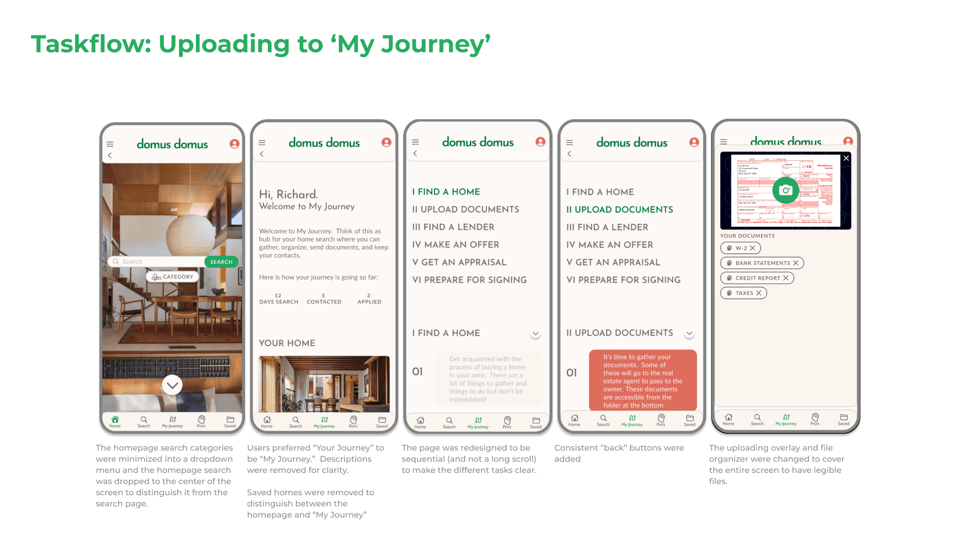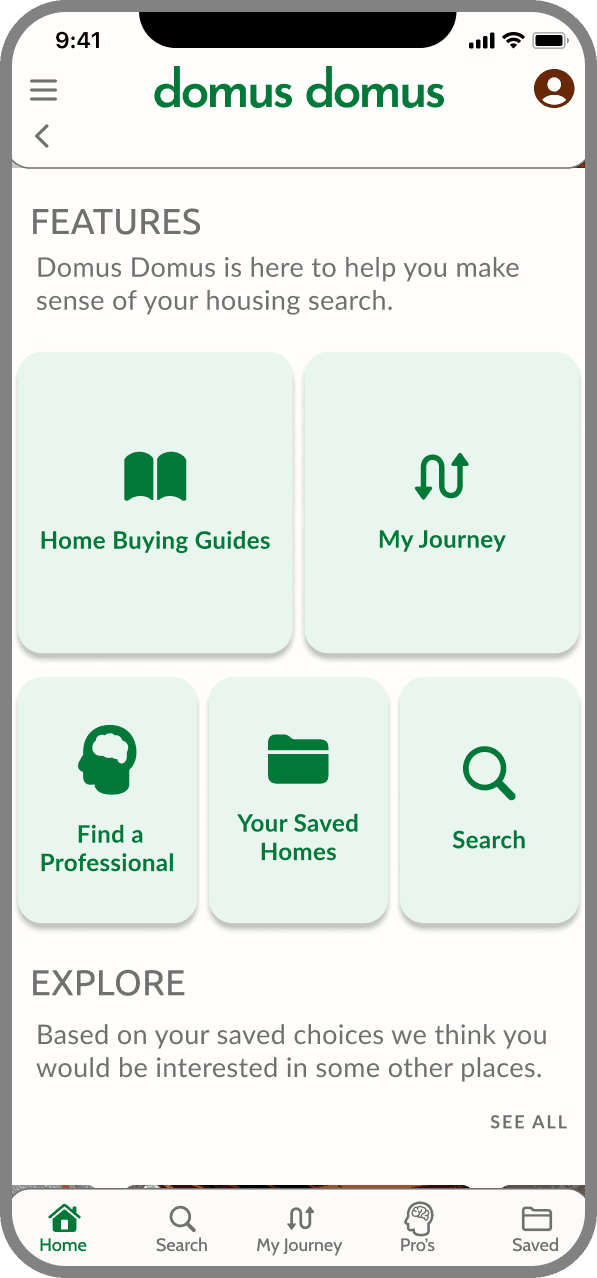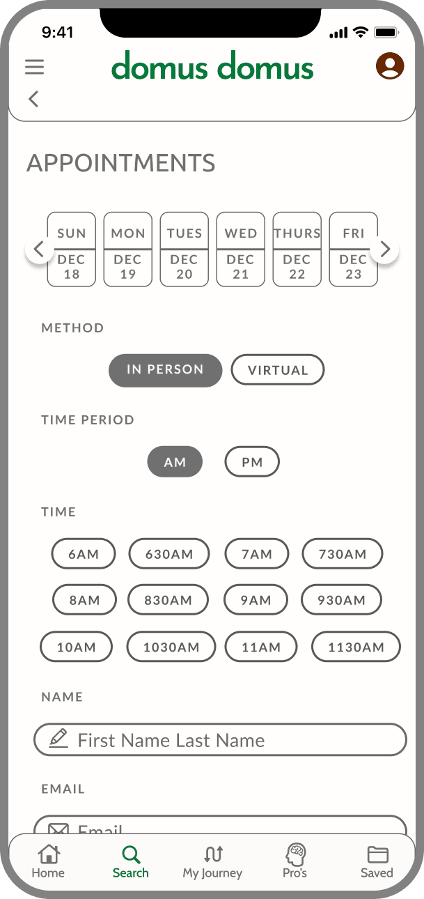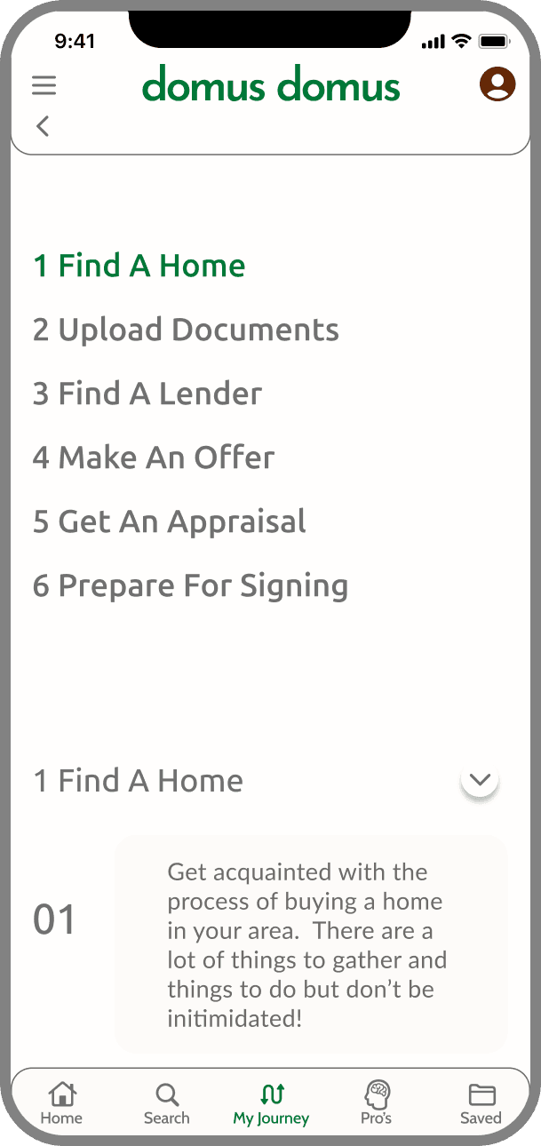 Domus Domus seeks to alleviate the stress caused by short timelines and coordination. The My Journey feature provides to be a guide that provides step-by-step instructions for the home buying process. It simultaneously serves as a communication tool, scheduler, and document repository for the process. Organizing and scheduling different parties is part contained within this feature - a source of anxiety for users.