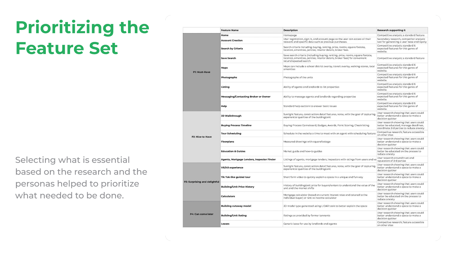 Determining the sitemap involved a card sorting exercise and feature priorization exercise. What features are most important?