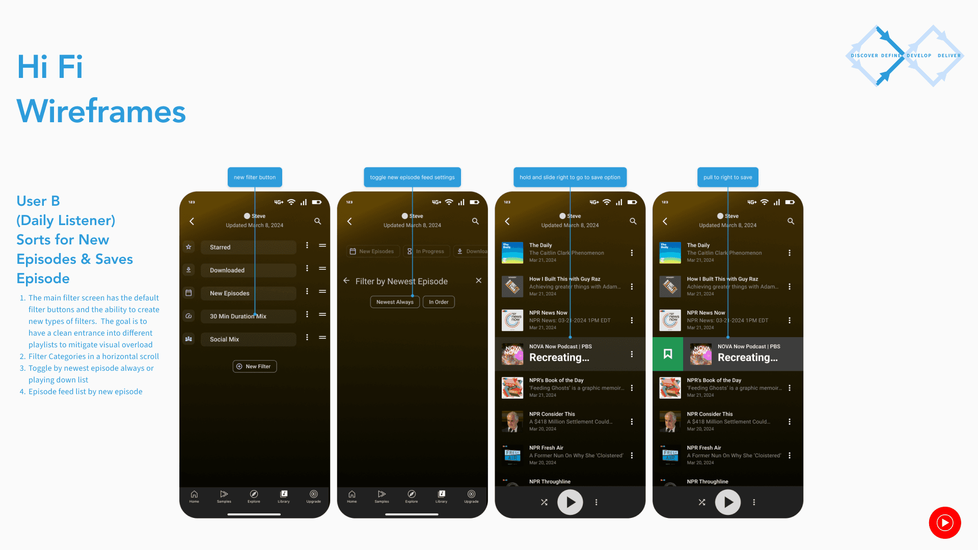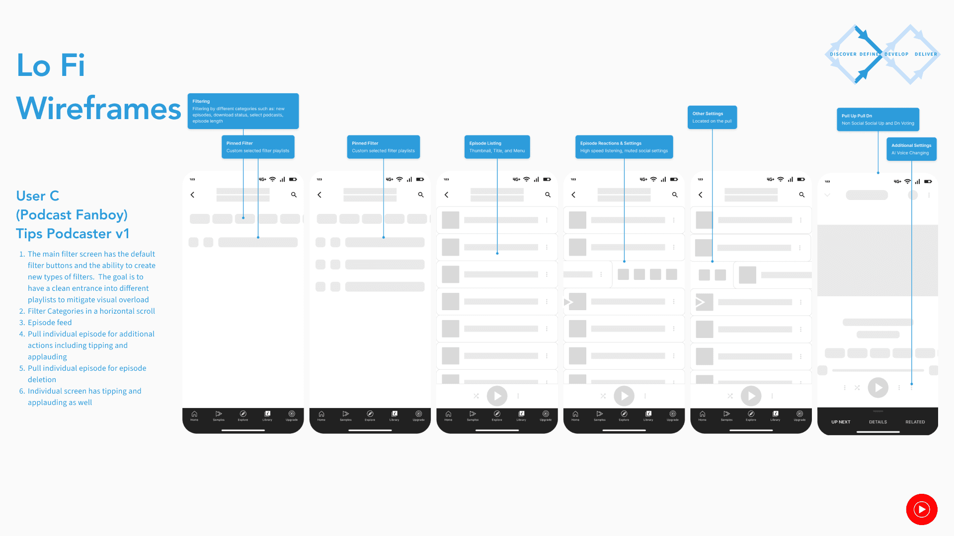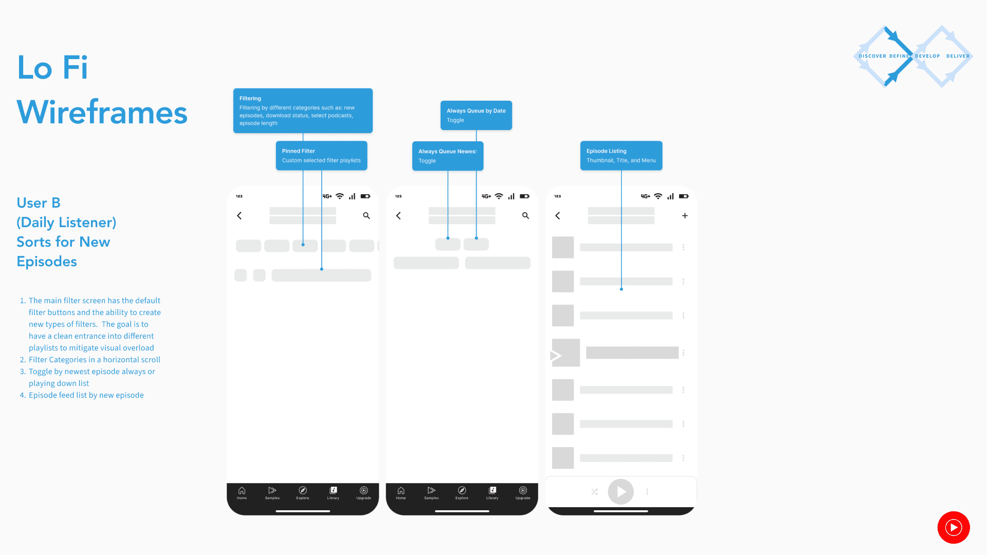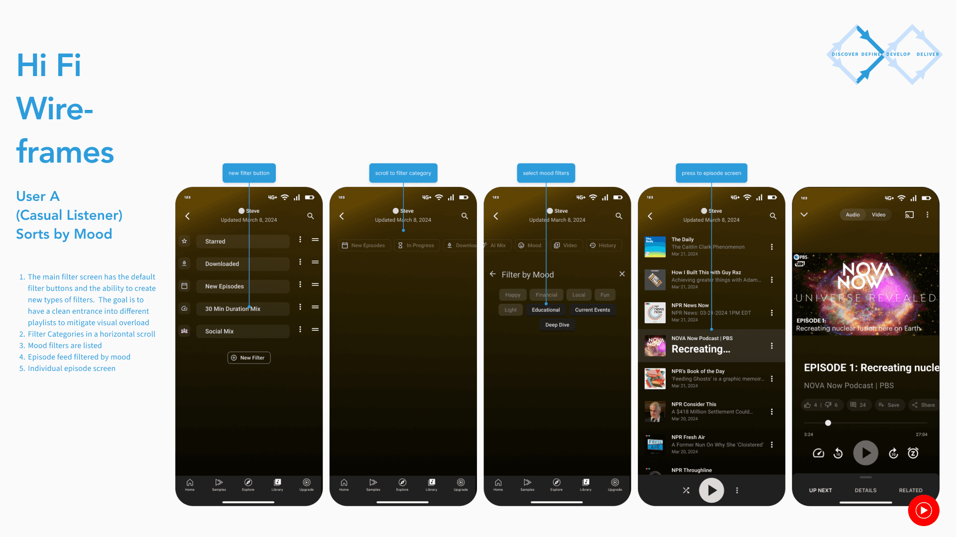 The goal is to create a simple, fun, and straightforward library feature that caters to serious podcast listeners and casuals alike separate of music streaming. It will draw on the strengths of the previous platform and creates a unique joyful listening experience.