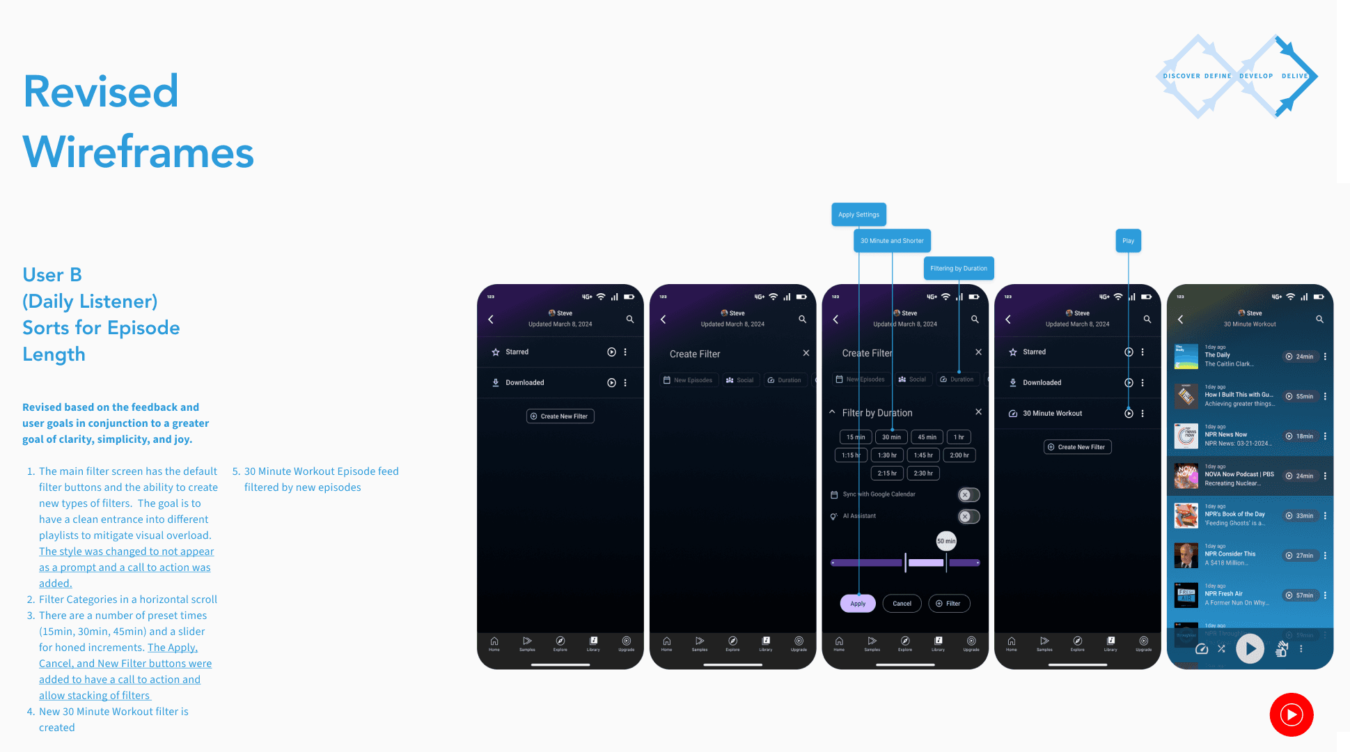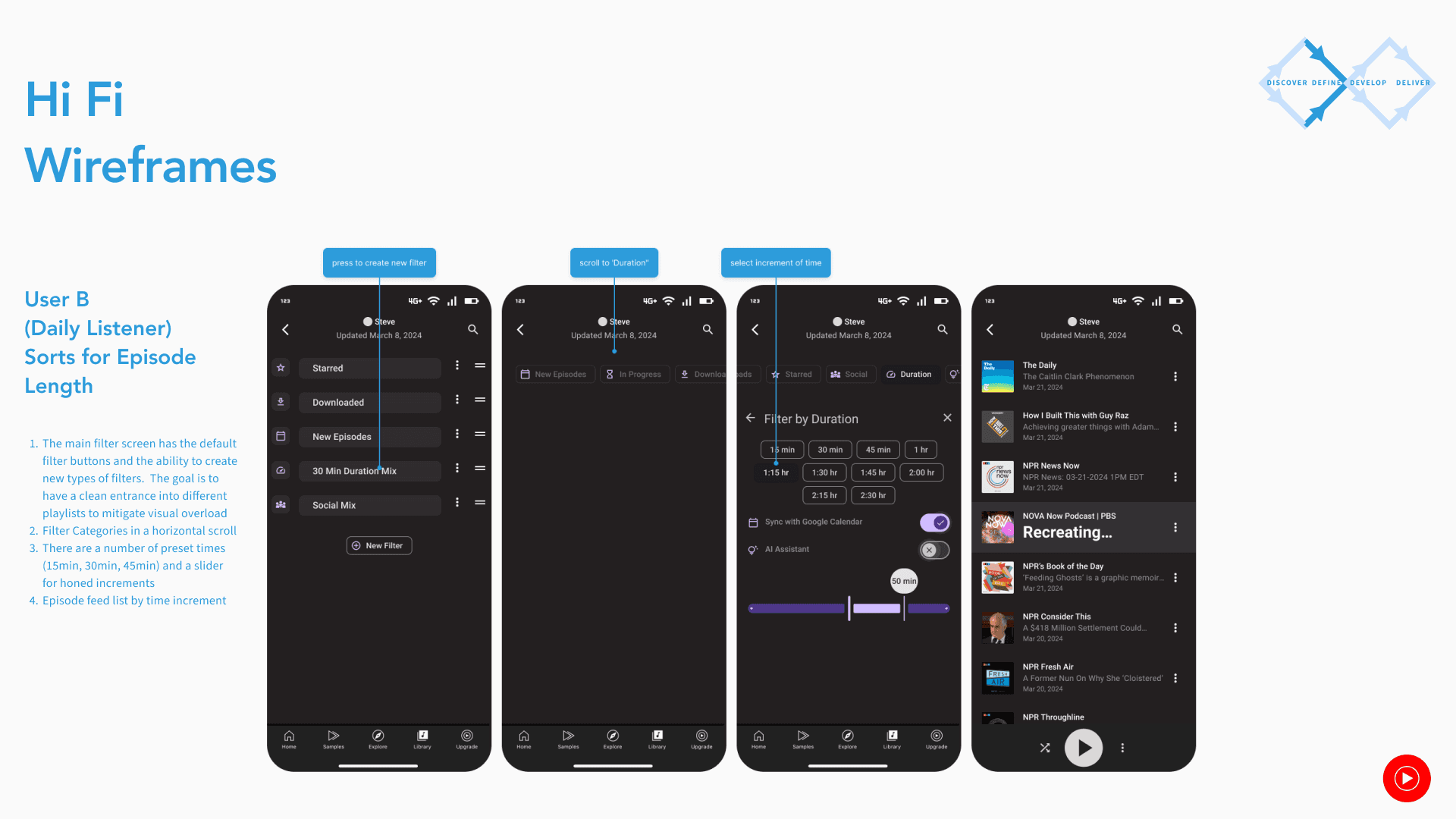 User research showed that users paired podcast listening with specific timed activities. I provided a filters for this as well as an opportunity to connect with google calendar.