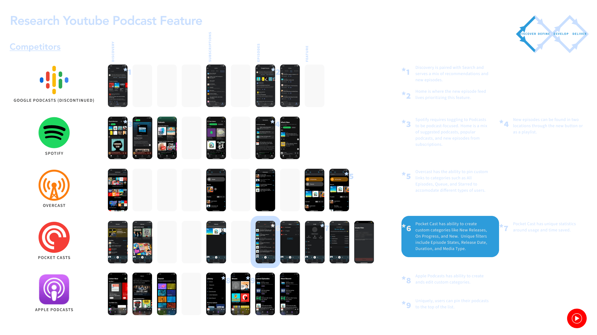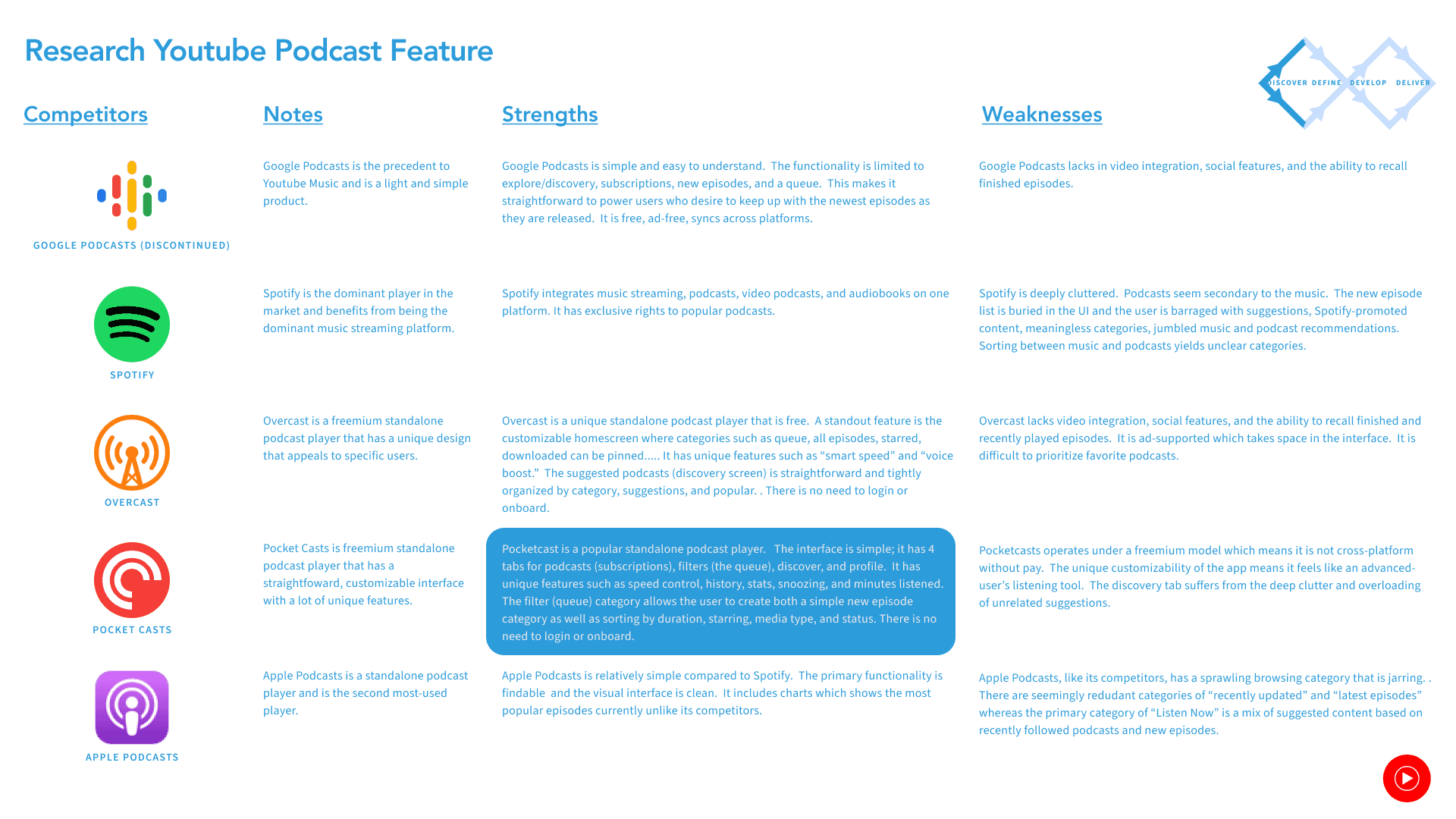 The challenge of this project is working within the existing design of YouTube Music. Google Podcasts was unique among the top three podcasting platforms; it was dedicated solely to podcast streaming and was simple and straightforward. This garnered it the number 3 ranking with a dedicated audience for its unique merits.