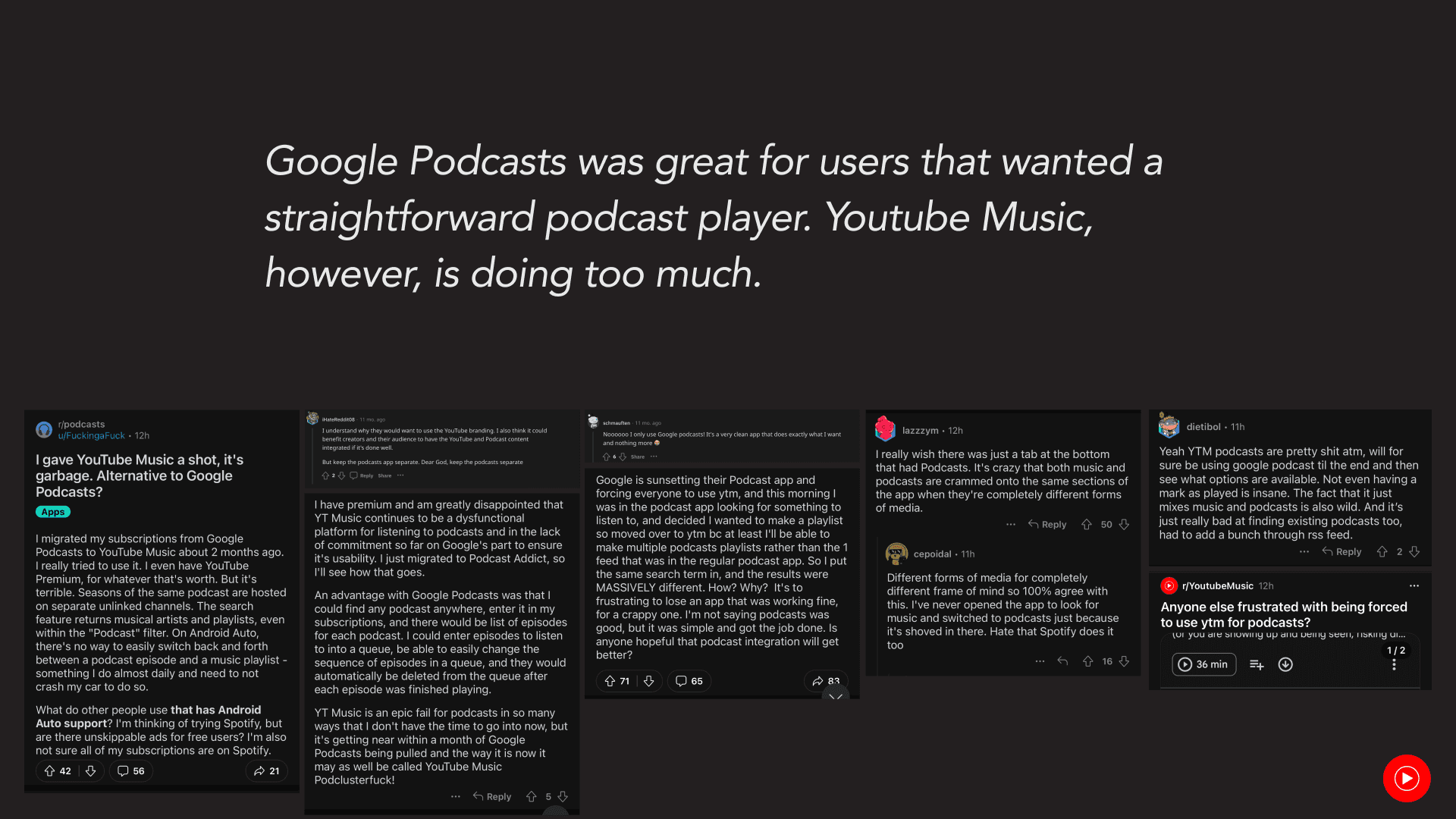 Conduct an audit of the best options out there, the most popular, the YTM platform currently, and the defunct Google Podcasts platform
